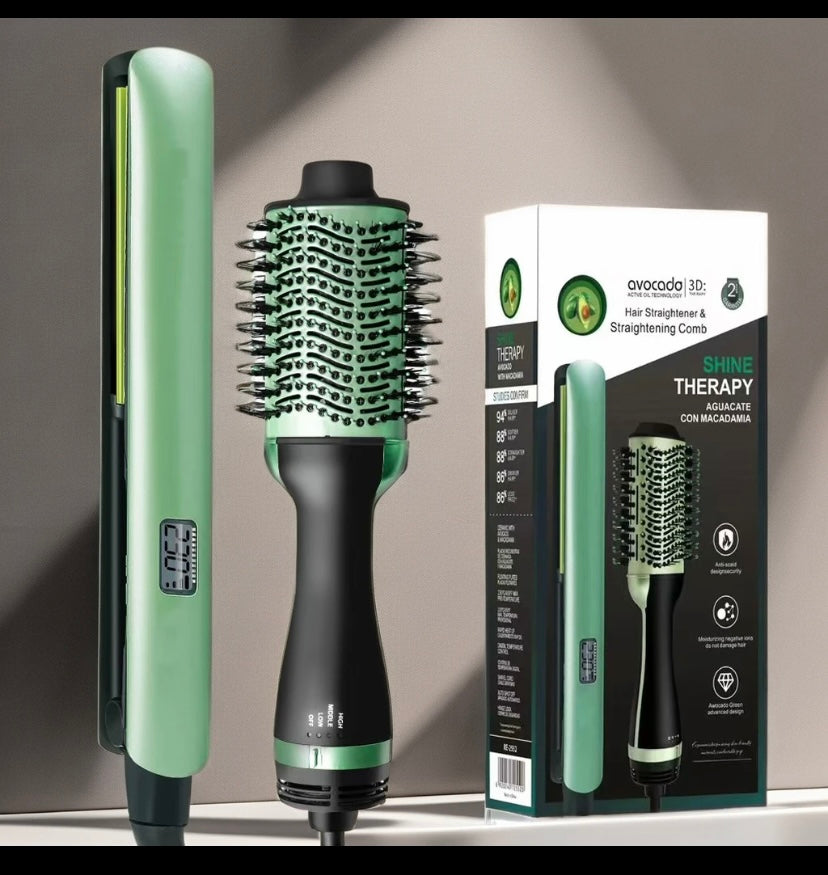 Transforme sua rotina de beleza com nosso Combo Cepillo Secador e Plancha, infundidos com o poder do aguacate e da macadâmia para um cabelo espetacular em casa!