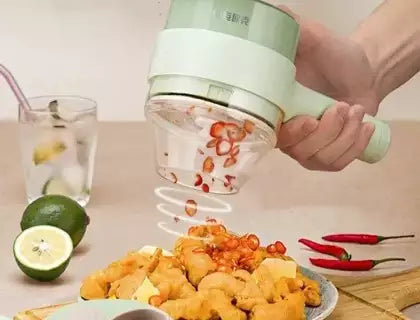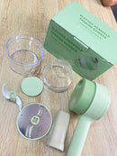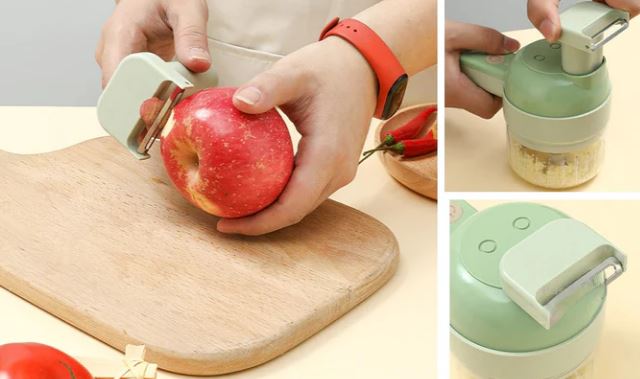 Con ella podrás tener un cortador de verduras y picador de carne con sólo cambiar los accesorios del set multifuncional. Es más cómodo cortar sus verduras frescas directamente en el recipiente, añadir la mezcla o condimento que desee de una forma súper práctica. Utilícela para triturar diversas verduras y condimentos como cebolla, ajo, guindilla, perejil, comino, jengibre y mucho más, El producto viene con un perforador que ayuda a insertar verduras o trozos pequeños, evitando accidentes, y también tiene un pelador de frutas en el lado opuesto.